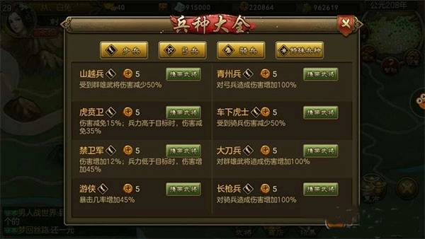 点评:山越兵对群雄目标的伤害提升100%;火箭兵针对特殊兵种的伤害加成达100%;重怒兵攻击特殊兵种时,不仅伤害增加,还会附加35%的眩晕效果。