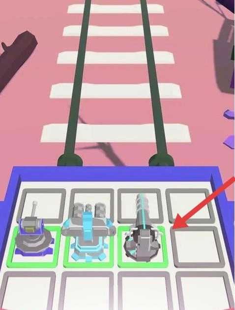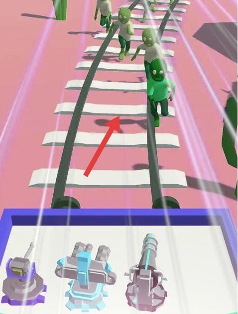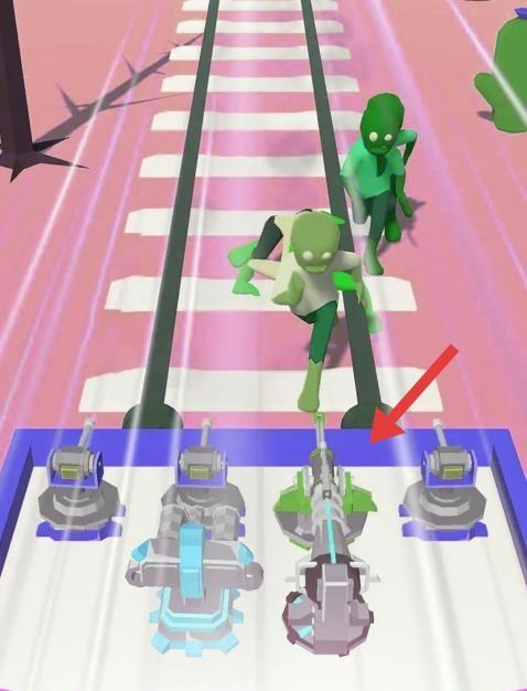 进入游戏后,当轨道上出现绿色僵尸时,可选择下方的炮台等武器,持续对僵尸发起攻击,同时保持前进的节奏。