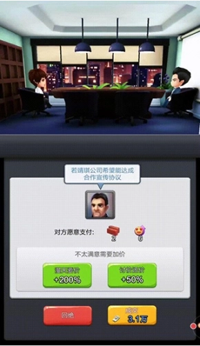 在会议室接待客户时,玩家选择【讨价还价】可额外获得50%的奖励加成,这个玩法的难度并不高。其实它就是我们熟悉的石头、剪刀、布游戏,操作逻辑很简单:先观察谈判代表方出的是什么,再根据对方的出法选择对应的手势就行。举个例子,如果对方出拳头,那你只有出布才能赢过对方。具体操作时,你只需盯着滚动的石头、剪刀、布图标,等布出现的瞬间点击【停】按钮就能获胜。而且【讨价还价】的滑动速度很慢,完全能看清下一个要出的是什么,所以跟着节奏选择就好啦。