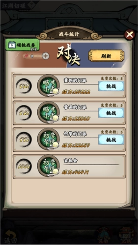 系统每天会依据玩家当前的最高战力,自动刷新出5位可供挑战的其他玩家。玩家每挑战一名对手,最多能从对方那里获取20积分,实际得到的积分数额,取决于战斗过程中成功击杀的敌方侠客数量。当敌方所有侠客都被消灭后,该敌人便会被击破,此后玩家无法再对其发起挑战。一旦玩家的积分满足积分宝箱的要求数值,就可以领取对应的宝箱奖励。