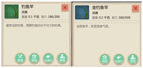 鱼竿是合格渔夫的必备工具,它分为普通鱼竿和金鱼竿两种,这两种鱼竿都来自各类活动的奖励。既然如此,我们还是踏实用普通鱼竿吧,它只需要1个牛筋和20块木头就能制作,性价比很高。(牛筋得杀公牛才能获得,最低等级的公牛是15级)