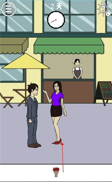 首先,在这个场景里有一位身着紫色衣服的女性,找到她后,把她移到男人的正前方(就像图中展示的那样),接着把鲜花递给这位女性,这样就能顺利通过这一关了!