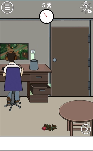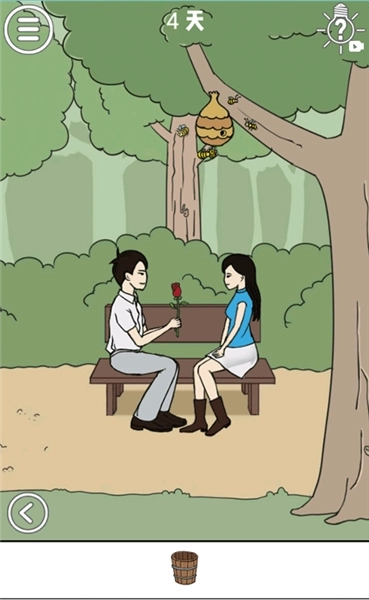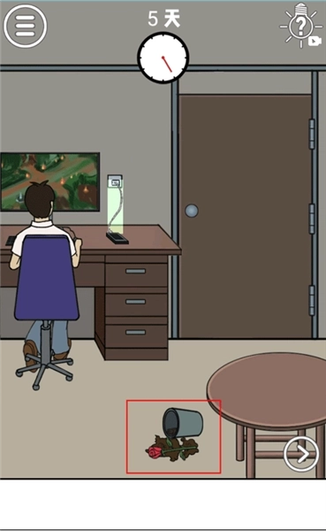 在这个场景的右下角,大树的脚边放着一个水桶。你需要先拿起这个水桶,走到河边打满一桶水,再把这桶水浇到旁边的玫瑰花地里。浇完后会收获玫瑰花,但别停下,继续往玫瑰花地浇水,直到整片玫瑰枯萎,最后把玫瑰花交给男子就能通关啦!