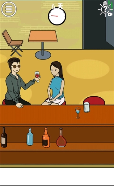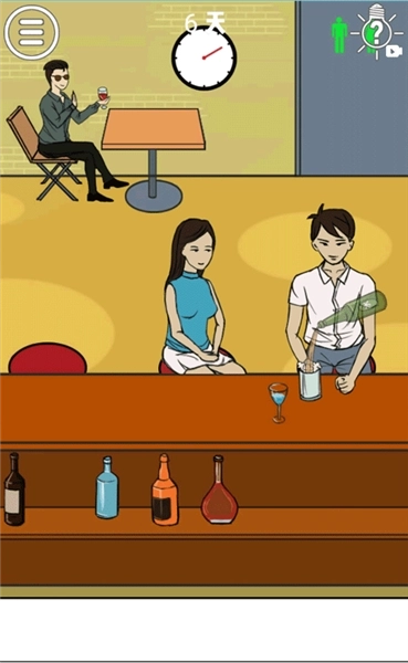 要让后排的男子顺利上位,就得先调虎离山,把这对情侣里的男方支开。第一步,点击白衣男子的酒杯给他倒酒,反复倒、反复倒、反复倒——重要的步骤强调三次。之后白衣男子会撑不住,起身去洗手间,这就是我们的机会了,点击把后排男子移到女子座位旁,这样就成了!