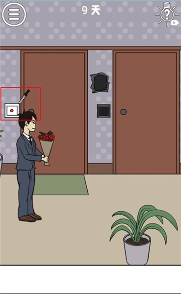 我们先把两个门之间的破洞弄开,里面藏着一把刀,把刀拿出来,接着用这把刀把左边门的门铃撬下来,然后装到右边的门上,再按一下门铃,哈哈,就是这样就是这样。