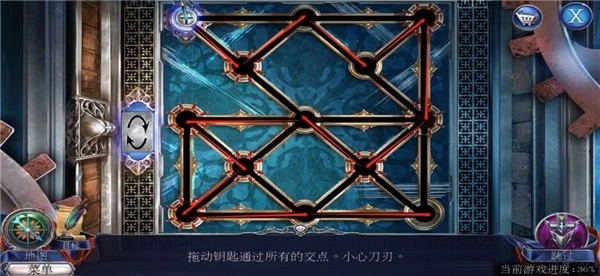 瀑布——寻物游戏——青铜盾石棺上——鼓槌木架子——放青铜盾,用鼓槌——赶走蝙蝠洞口——吊车部件