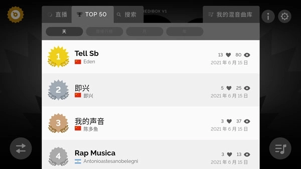 Top50图表是基于每个组合的投票数的排名。您可以观看和聆听由全球社区创建的混音,因此您可以享受每个用户的音乐创造力并从中获得灵感。