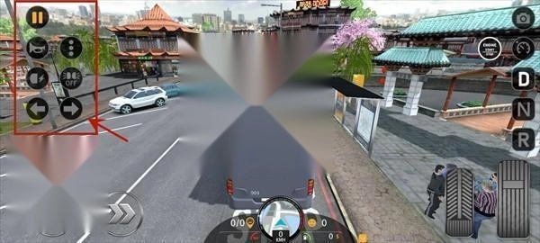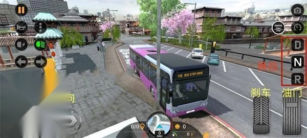 7、进入游戏后就可以操作,小编在图中为各位小伙伴进行了简单标注,其中D为前进挡,也称驱动挡;N为空挡,暂时停车时(如红灯),注意,此挡位表示空挡,为防止车辆在斜坡上溜动,一定要踩着刹车。R为倒车挡,倒车时用。