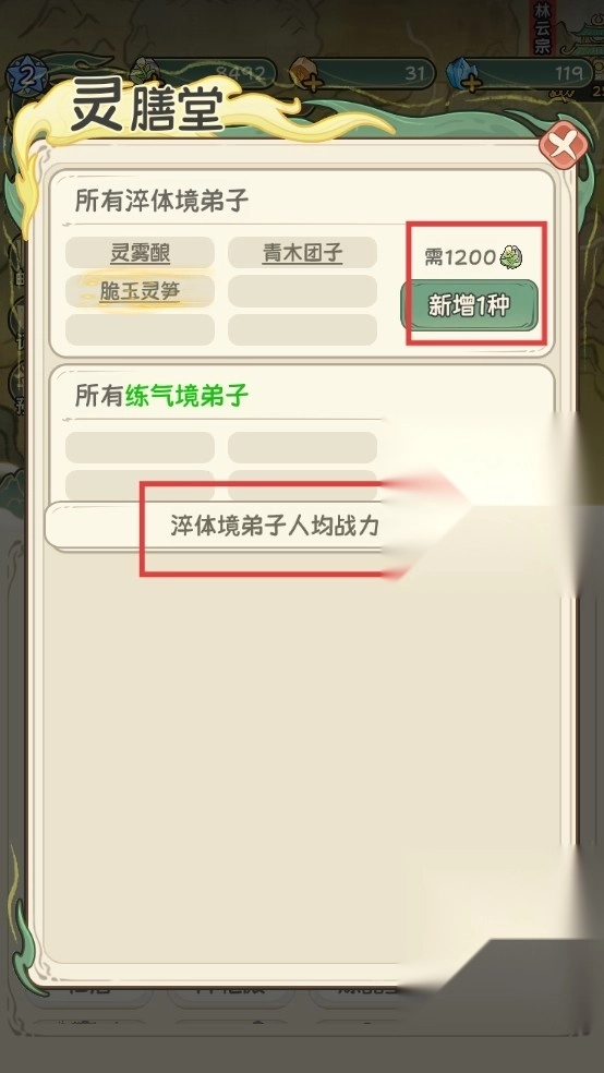 3、通过在灵膳堂消耗资源来新增菜品,能够提高淬体境弟子的人均战力,从而增强宗门的整体实力。