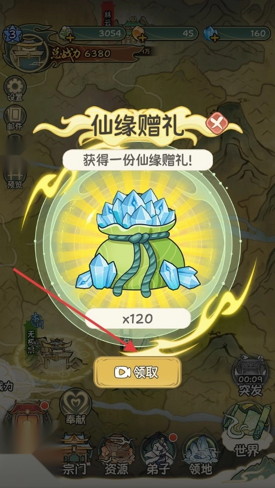 4、当出现【仙缘赠礼】时,点击【领取】按钮,即可获得资源奖励,为宗门发展提供助力。