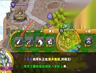 3、点击基地或兵营,然后点击升级升级,点击左下角的箭头来加速游戏。