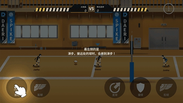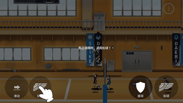 2、这里以自动模式为例,首先我们需要熟悉滑动、扣球、发球、接球等操作;