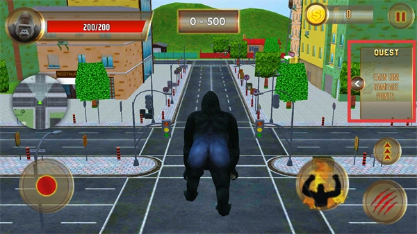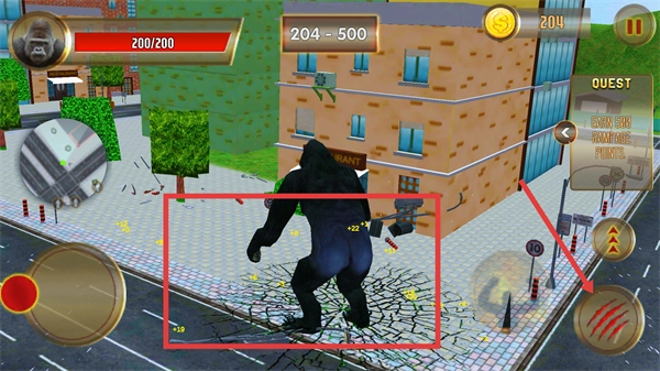 3、操控金刚在红色框选的区域内破坏建筑与设施,以此获取金币和经验,进而提升战力。