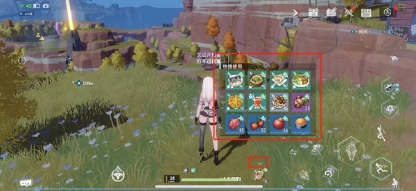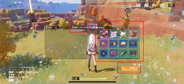 11.切换食物:点击食物上方的小箭头,可展开食物栏,查看所有现有食物,点击即可直接装备。