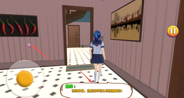 进入场景后查看下方的任务指引,比如吃早餐、去学校认识新朋友等,跟着提示操控角色移动来推进流程。