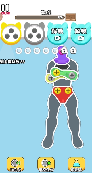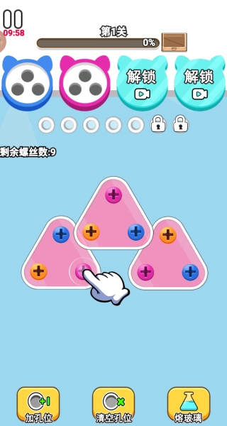 每一关都设有步数或时间的限制,你要在这些有限的资源条件下,合理规划移动的先后顺序,以高效的方式达成消除所有指定颜色螺丝的目标。