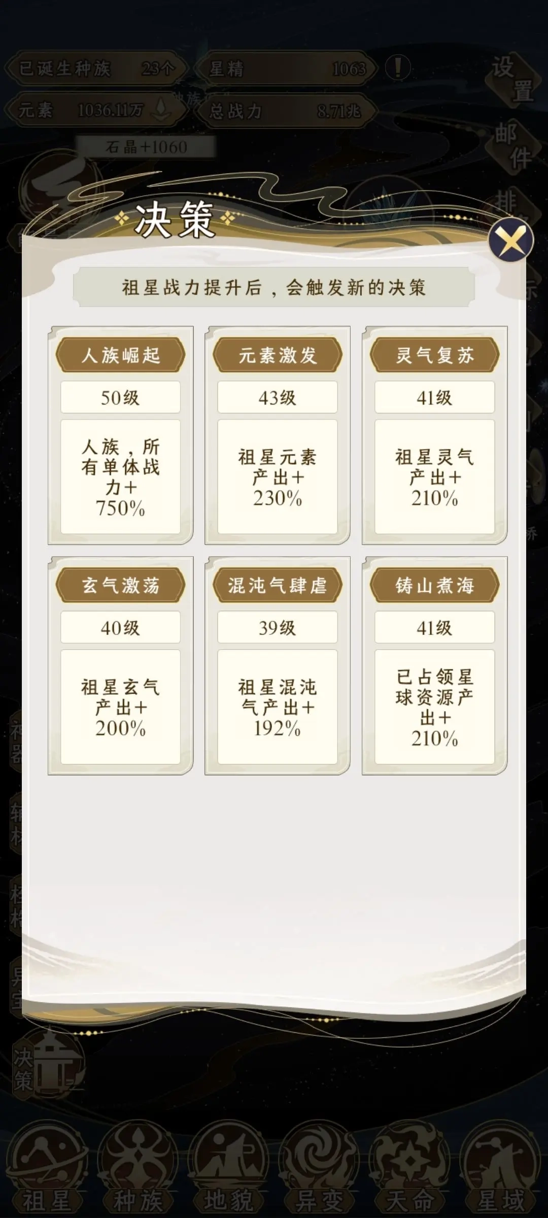 人族在刷满当前已解锁品质的限量资源后,就通过提升地貌来增加族数,直到解锁下一个品质的限量资源为止。