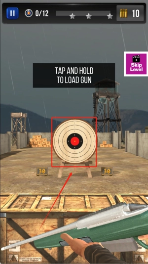 按照“TAP AND HOLD TO LOAD GUN”的提示操作,长按屏幕来装填绿色枪械,接着对准两侧标有30分的红色靶心开展射击练习。
