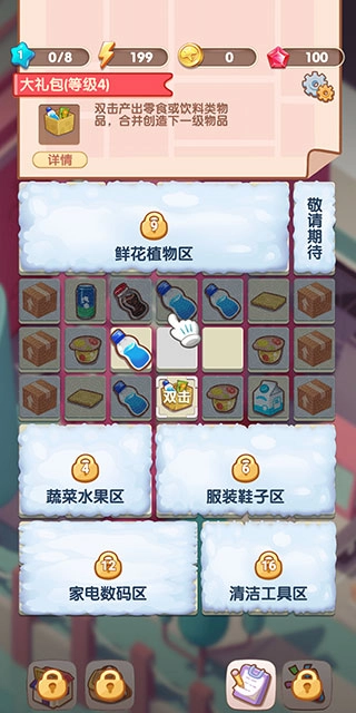 合成操作:将亮色矿泉水移至暗色区域合成新商品,解锁新区域。