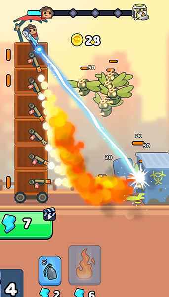 3.在未来的时代里,由于科技被滥用,一种病毒随之蔓延开来。这种病毒会引发变异现象,使得僵尸横行无忌,自然资源和科技文明都因此遭受了沉重的打击。为了守护人类、重建家园,玩家将化身一名幸存者,亲手打造专属战车,与僵尸展开一场又一场惊心动魄的战斗。