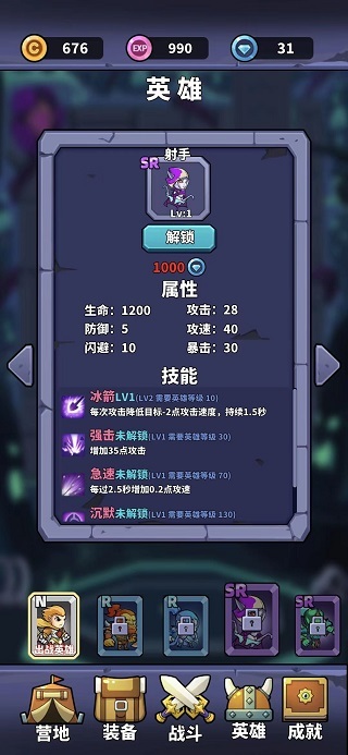 在主界面点击“英雄”选项,即可浏览所有已推出的英雄角色(当前共开放5个,后续还会持续更新增加)。每个英雄都具备独特的品质等级、属性面板与专属技能机制。
