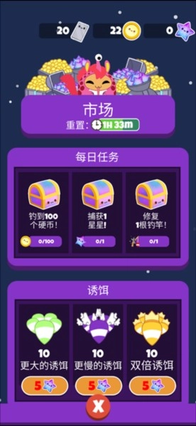 3、通过钓鱼获取丰富资源,用于升级宇宙飞船,进而前往更多未知的星系空间。