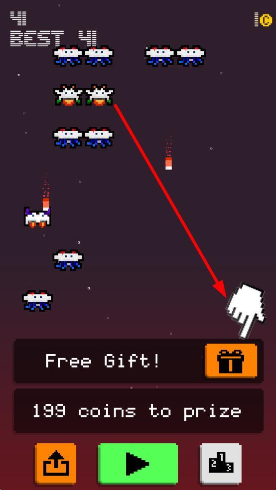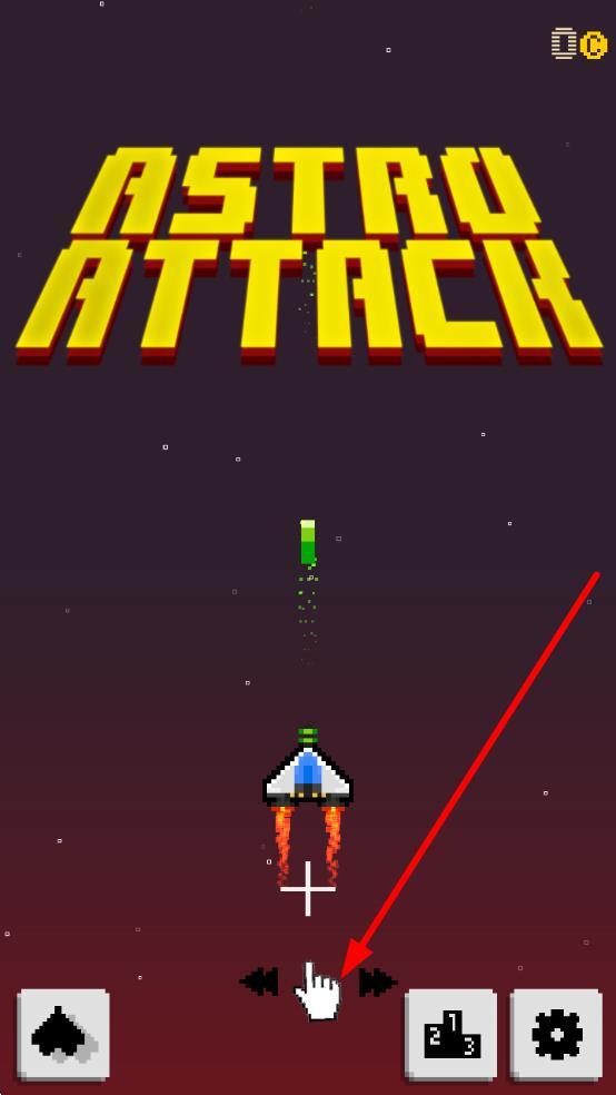 1、进入初始界面后,点击箭头所指的左右箭头按钮,即可操控飞船左右移动,开启太空射击冒险之旅。