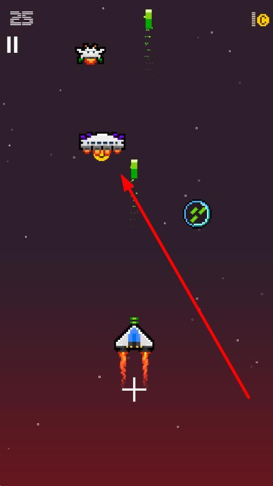2、通过移动按钮操控飞船,让瞄准箭头对准敌方飞船,发射子弹将其击落,同时注意躲避敌方的攻击。