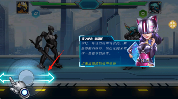 1、新手引导阶段,请按照“光之使者奥蒂娅”的提示,通过遥感(箭头指向处)操控机甲移动,以此熟悉基础操作。