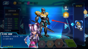 2、机甲养成的操作在机甲界面进行,按照箭头的指引,穿戴“装甲配件”,以此提升“迅影刺杀者”等机甲的各项属性,从而增强整体战力。