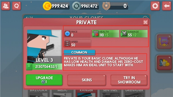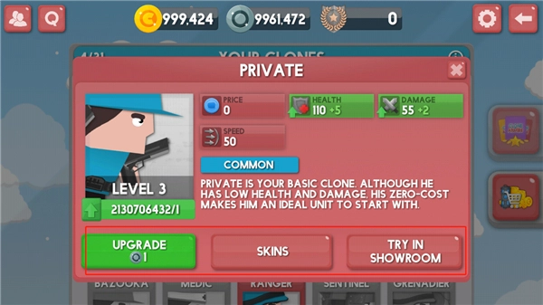 4、页面左侧按顺序排列着升级花费、皮肤选项与展示厅这几个板块,点击绿色的升级按钮,同时消耗一枚铜币,就能对该兵种进行强化。