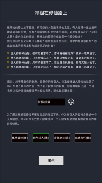 在这样的背景下,玩家所扮演的角色诞生了。由于家境贫寒,无力抚养,这个婴儿被遗弃在一户大户人家的门前,幸运的是,一位下山救助世人的修士发现并收留了他,将他带回宗门抚养。在宗门里,玩家角色慢慢长大,学会了一身功法,然而因为自幼与世隔绝,始终无法领悟“道法自然”的真谛,导致境界难以突破。因此,玩家决定下山历练,亲身感受人间的冷暖,以领悟世间的道法。