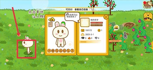 9、若想修改角色名称或查看个人信息,点击兔子的肚子即可打开面板信息。
