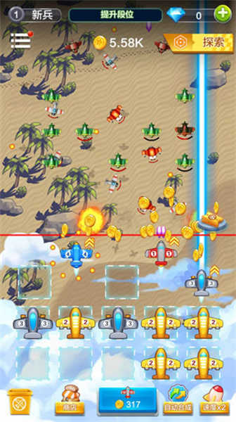 通过合成同型号飞机来完成升级,解锁等级更高、火力更强的战机,一步步打造专属于你的空中帝国。这些强大的战机能够持续为你生产金币,是提升战斗力的核心要素。