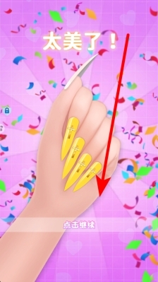 3、完成甲油涂抹等步骤后,屏幕会出现“点击继续”的提示,此时点击对应的区域,即可进入后续环节,最终能看到制作好的美甲作品,体验美甲创作的乐趣。