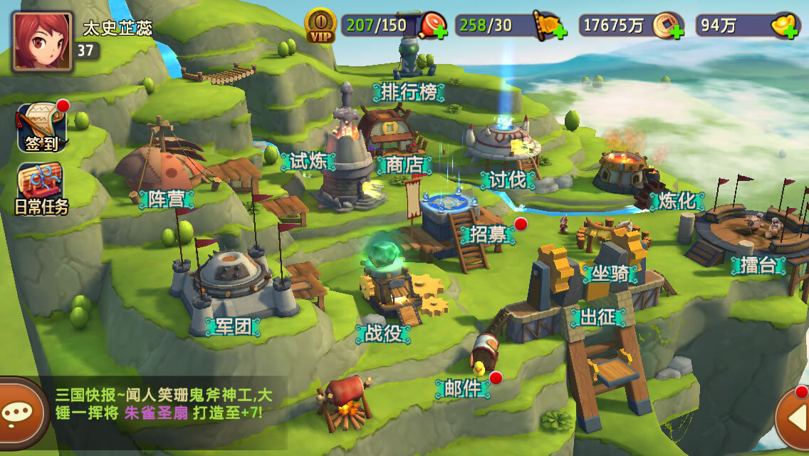 游戏的主界面运用了当前流行的3D场景设计,每座建筑都具备对应的功能,尤其是场景里的角色,像城墙旁的小兵会持续巡逻,还时不时抱怨几句,这个小细节让我忍不住会心一笑!