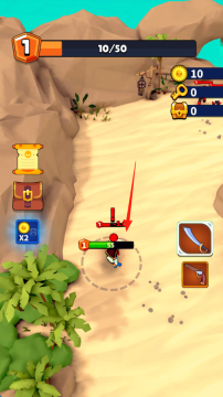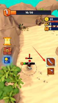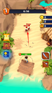 1、从进入游戏直至开启第1关,操控海盗角色,依照箭头指示的方向移动并靠近敌人,做好战斗准备。