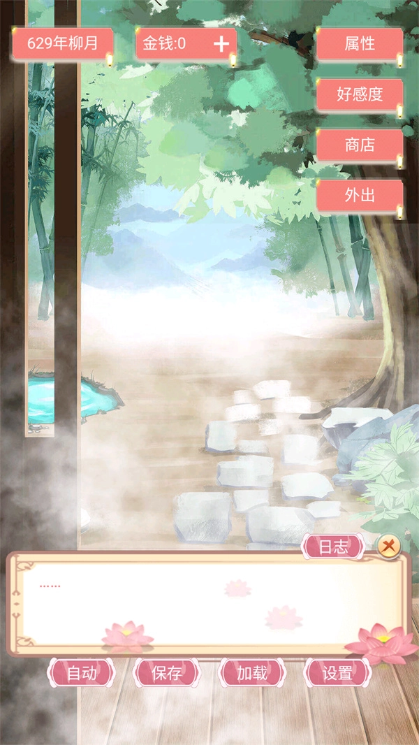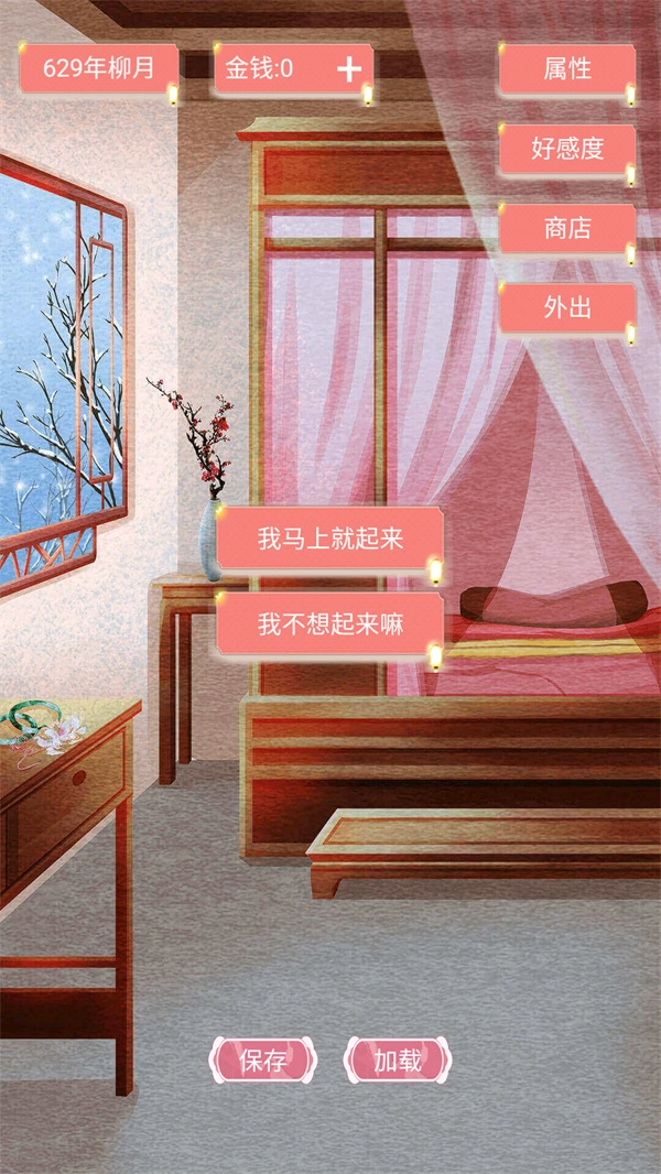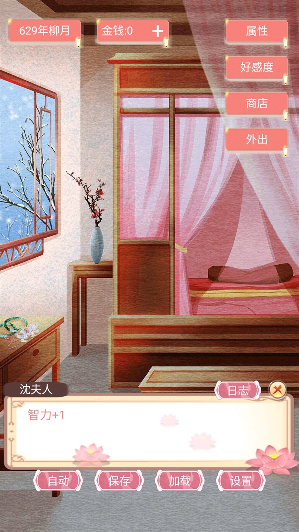 3、正式进入后,界面新增了多项功能:通过“属性”可以查看主角的各项能力值;“好感度”能展示四位男主对女主的情感倾向;“商店”支持道具的购买与使用;“外出”功能则用于触发新事件、推动剧情发展。