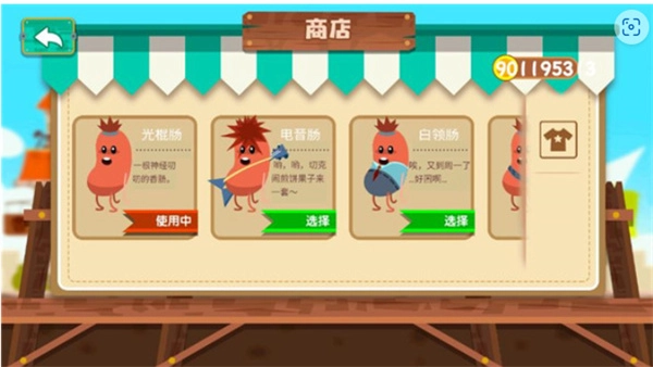 1、刚进入时先别忙着开始,点击左下角的小衣架图标,先给香肠换上一身新装扮,花哨的程度能和动漫角色相媲美。