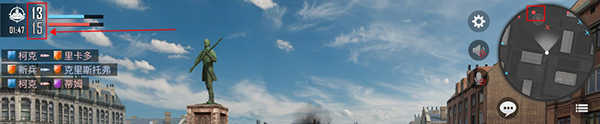 5、正常游戏的比分会显示在左上角,在倒计时结束前,哪支队伍先达成人头目标就能获胜,或者倒计时结束后人头数更多的队伍直接获胜;另外,右上角的地图能够查看敌人和队友的动向,其中红色代表敌人,蓝色代表队友,白色则是自己。