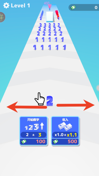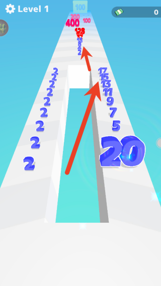 游戏启动后,玩家会操控一个初始数字在赛道上前进,通过手指滑动屏幕来灵活调整移动方向,要留意躲避电锯之类的固定障碍物。