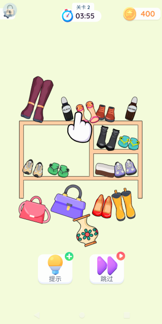 3.进入第二关后,玩家的任务是整理鞋柜,需把鞋子、包包之类的物品摆放至恰当位置,方可顺利通关。