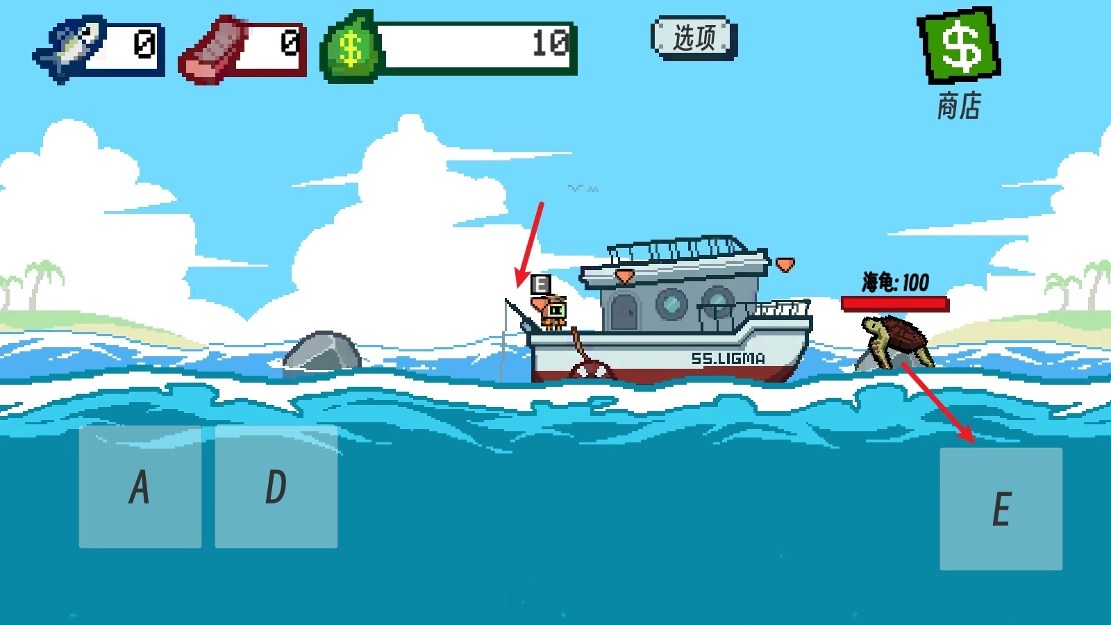 1、进入游戏后,我们需要走到最左边的鱼竿处,按E键即可开始钓鱼。