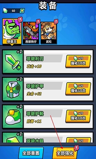 6、每位英雄还有自己独特的装备,玩家可以对其进行一键强化升级,提升战力。