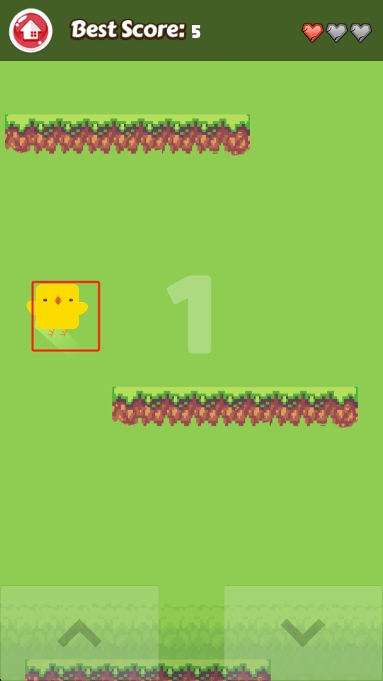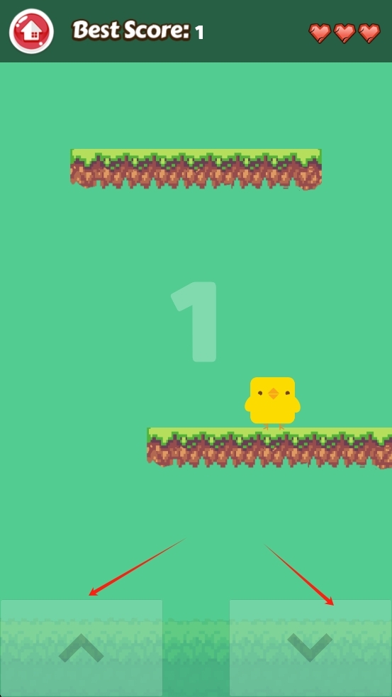 进入作品后,点击屏幕下方的左右箭头按钮,就能操控黄色小鸡跳跃,让它越过绿色草地之间的沟壑,同时收集分数。