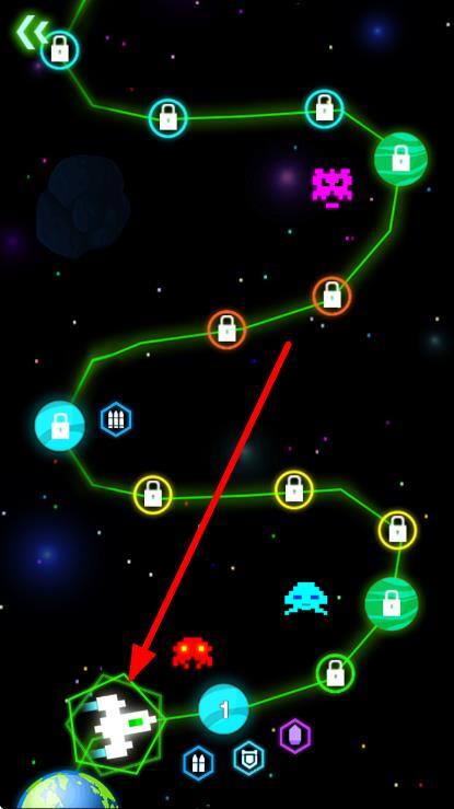 在关卡地图里,找到箭头所指的已解锁飞船并选中它,就能进入对应的太空战斗场景,为对抗外星敌人做好准备。