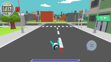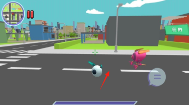 2、进入城市街道后,操控带有箭头标记的机器人,进行【移动探索】,以此触发和粉色机器人的互动任务。