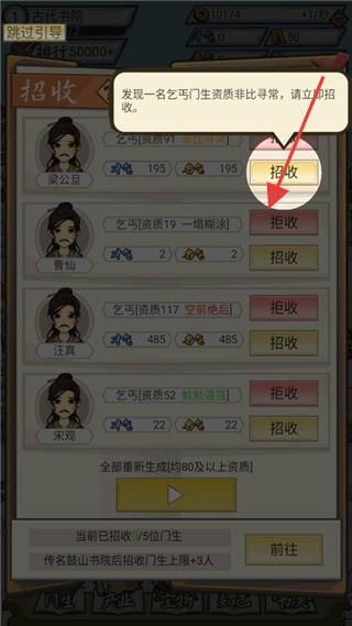2、进行“门生招收”操作!点击“招收”按钮进入相关界面,筛选出资质≥80的门生,通过2次确认招收的步骤,注意不要选错低资质门生,最终完成5名优质门生的招收任务。