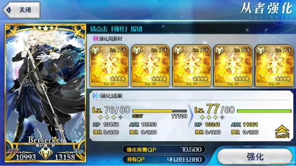 同时,因为星级越高的从者强化时消耗的QP越多,所以部分低星级狗粮不太适合用来强化高星级从者,不然前期有限的QP会变得非常紧张,建议50级以上的五星英灵不要用四星以下的狗粮进行强化。