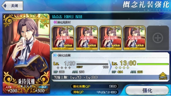 在强化过程中,若使用同一张卡牌进行强化,不仅能获得卡牌经验值,还能提升等级上限。当完成4次突破极限后,概念礼装的技能也会随之强化,从而让携带该礼装的从者在战斗中的表现更上一层楼!